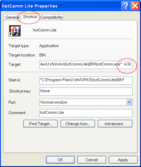 These instructions show how to add the command line option -k30 to hotComm Lite. Use the same instructions for any other hotComm Windows product and command line option.